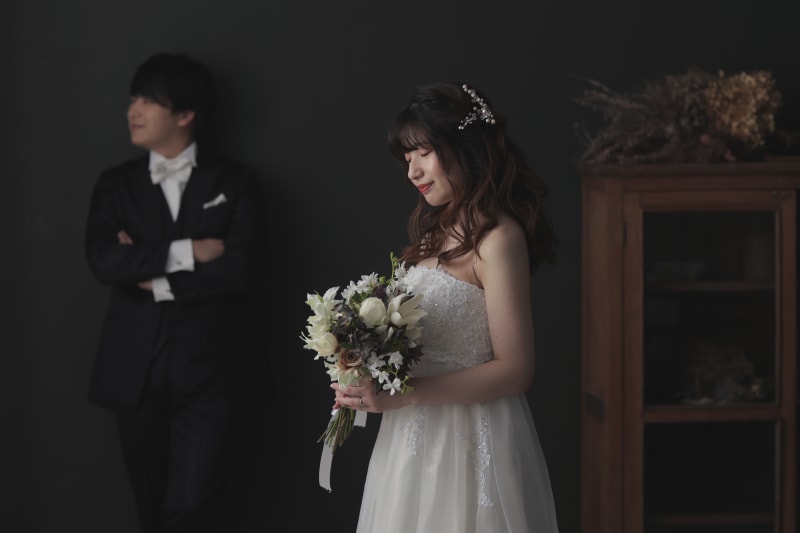 背景は先ほどと同じですが、後ろに小物が入っているとアンティークな雰囲気になりますね! 見つめあっているお二人素敵です〜!