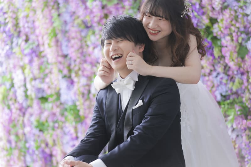次は藤の花を背景に! いろんな背景がある中でもこの背景は選ばれる方が多いです!! 見ているだけで幸せが伝わる一枚ですね☺︎