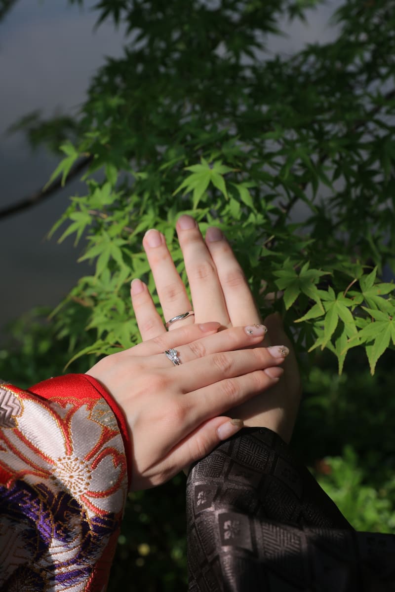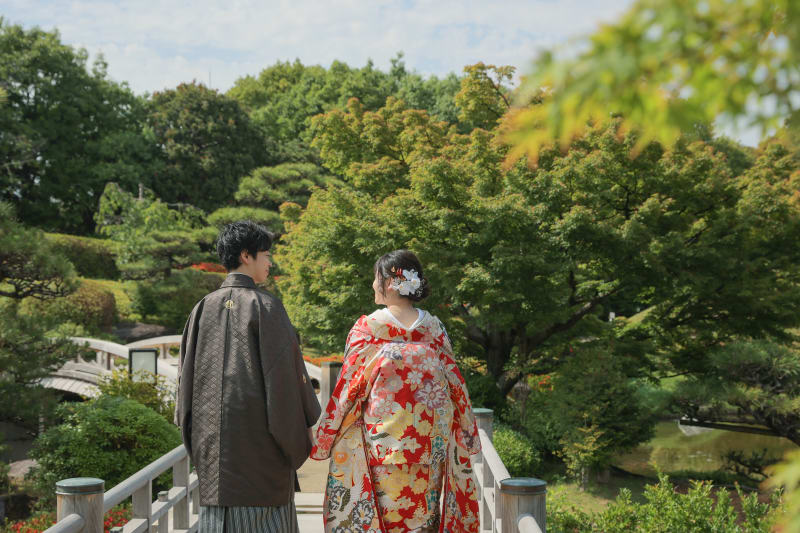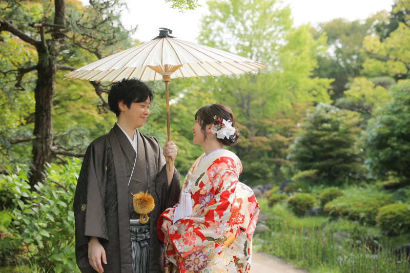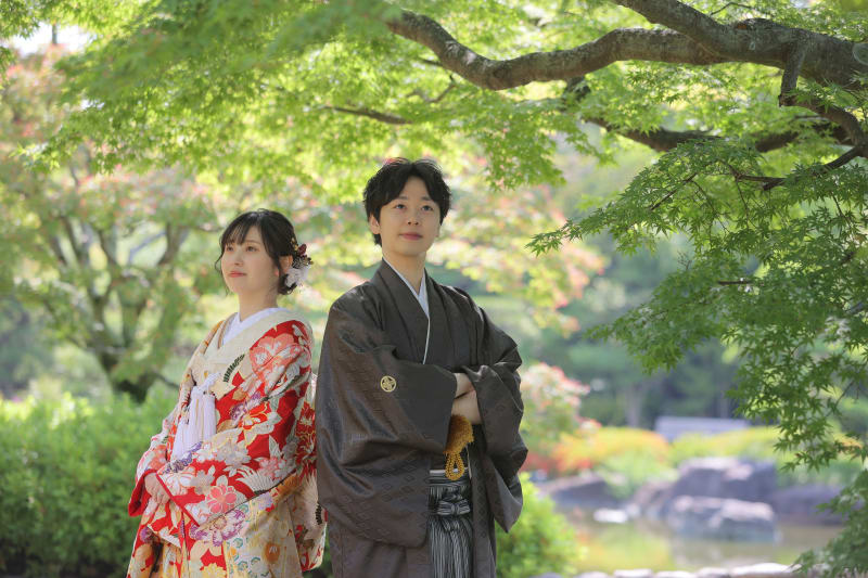 緑の中に赤い色打掛がとても綺麗に映えていて素敵です☺︎