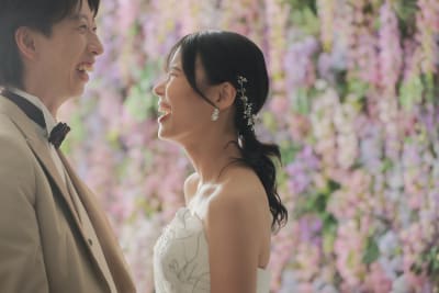 - フジの花を背景に撮影! たくさんのお花に囲まれて一気に華やかになりますね♪ お二人の表情が自然で素敵です〜^^
