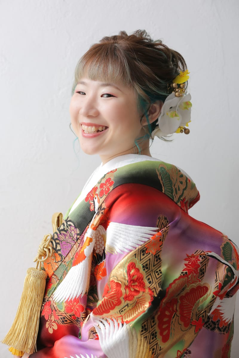 グリーンのインナーカラーと着物の相性がバッチリです👌
