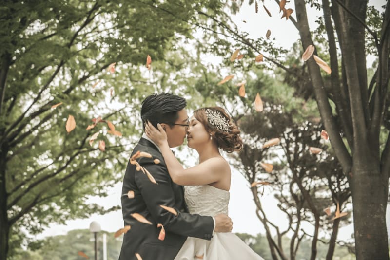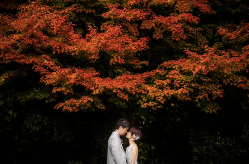 秋らしい葉っぱを使ったキスシーンもオシャレです!