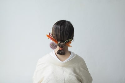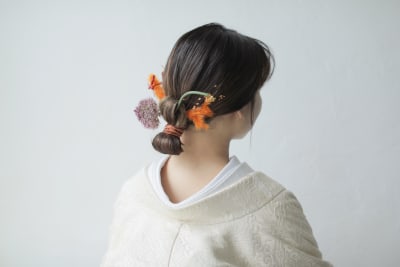 ヘアセットを活かせるよう、新婦様持ち込みの生花と金箔を散らしてトータルで映えるようにヘアセットをさせて頂きました^^