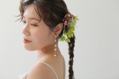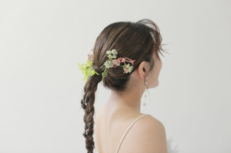 こんな感じで、生花をヘッドアクセとして使ってカジュアルかつオシャレに華やかさを出したり、自分好みで色味や花の形をつけていただけるのでおすすめです!!その日限りで綺麗に写真を残せるのも生花のいい所ですね^^