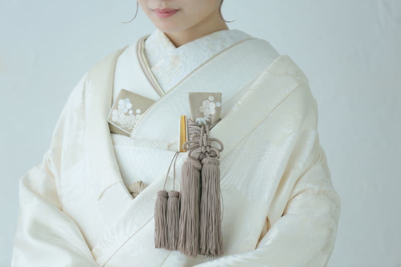こちらは少しクリーム色がかった白無垢に優しい風合いのベージュのお小物を合わせて