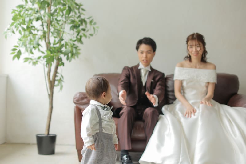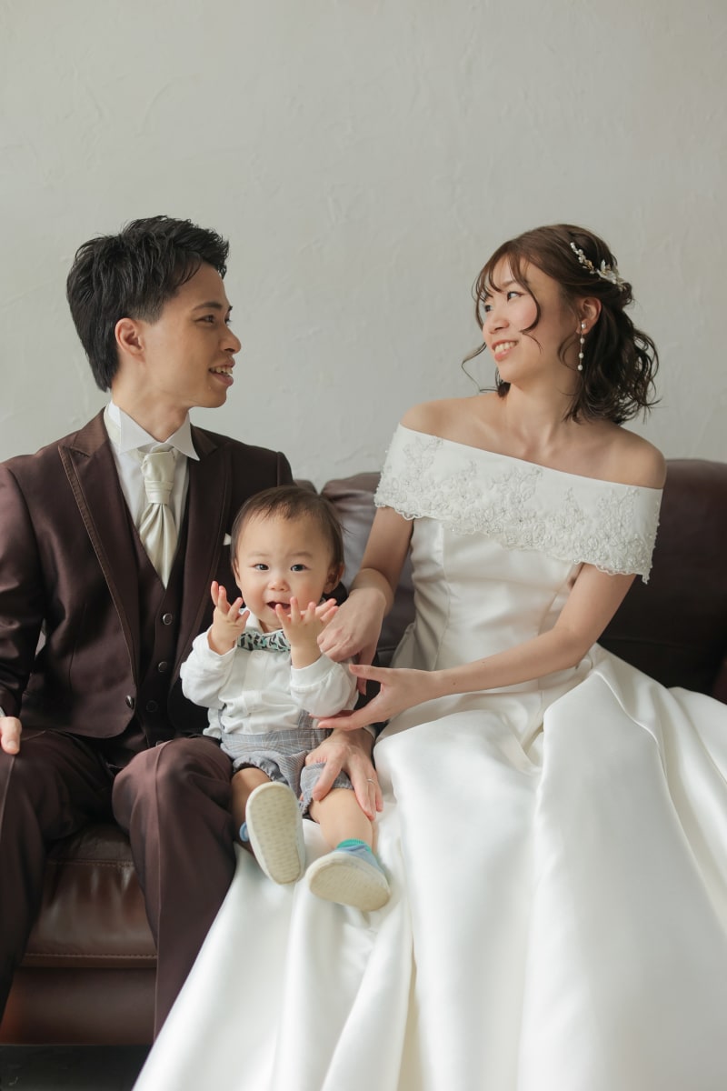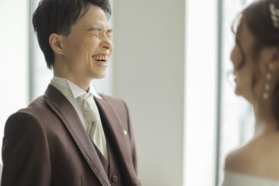 クールな表情の新婦様、全力笑顔の新郎様のギャップが微笑ましいです!