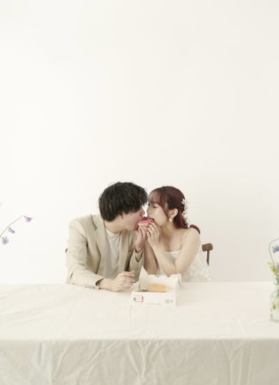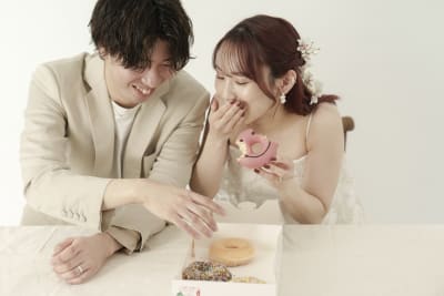 ドーナツをお二人で♡ 美味しそうに食べている姿がとても可愛いです♪ お花やドーナツなど、お持ち込みいただけると撮影で使用することができます☺︎ 何か使いたいものがあればお気軽にご相談くださいませ!