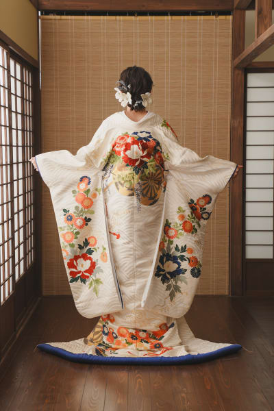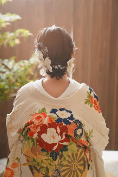 昔ながらの赤色の色打掛も多いですが、ベージュの色打掛は白無垢と色打掛の間くらいでお召しいただけます🫧