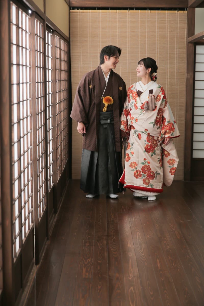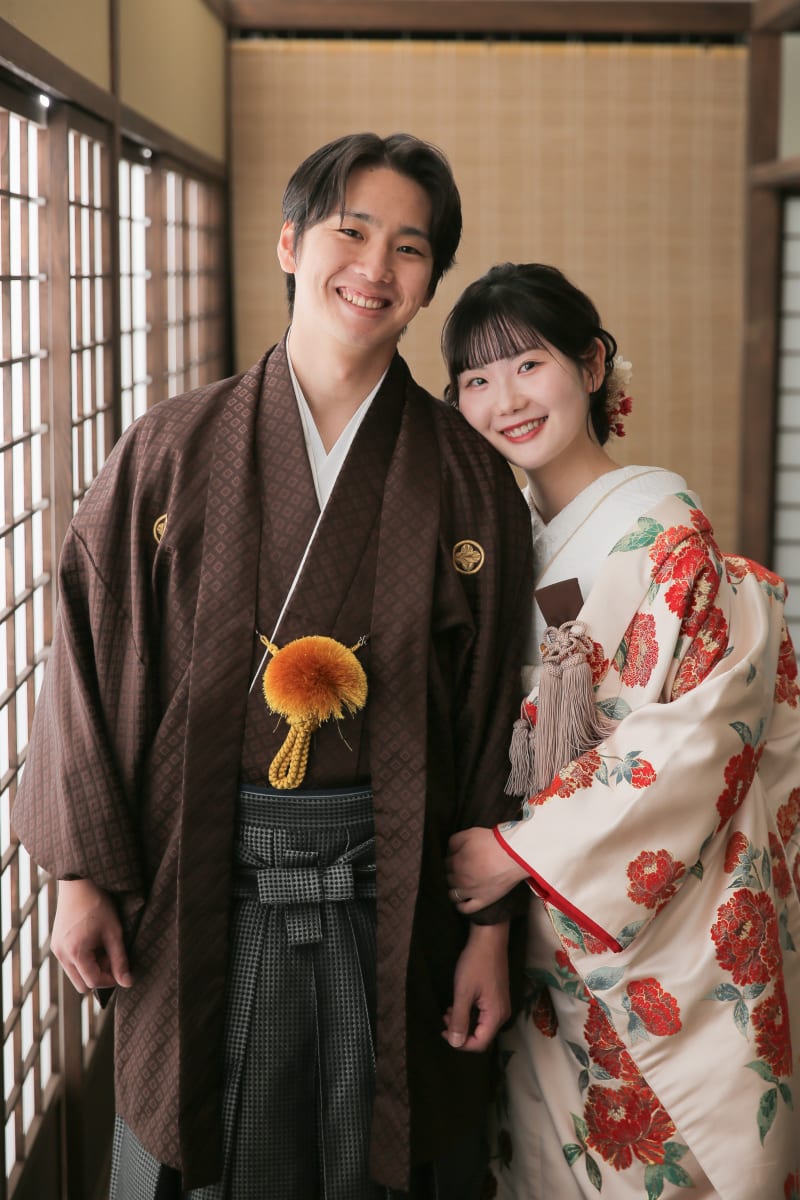新婦様の小物と新郎様の着物をブラウンで揃えてとてもおしゃれです🤍