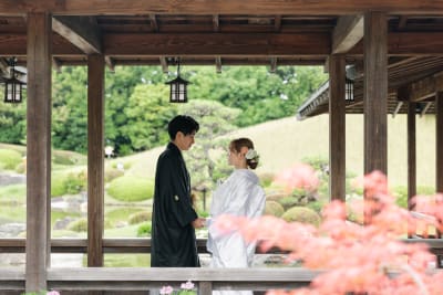 新緑がいっぱいの日本庭園では、純白の白無垢が本当に映えますはく👏