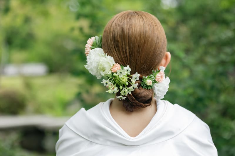 シンプルなヘアスタイルにふんだんに生花を使いました💐