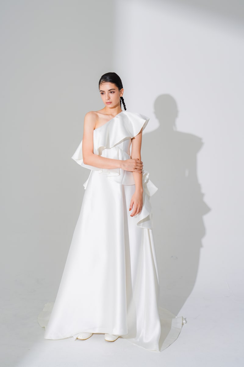 また、レースやシルクなど素材にこだわりその表情を活かすことで、遊び心のある大人の女性にふさわしいモダン・エレガンスなウエディングスタイルに定評があります。