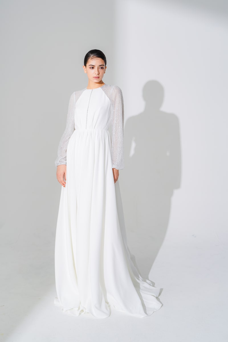 袖と背中がシースルーにビージングが施されたシンプルな中にも煌びやかなドレス。