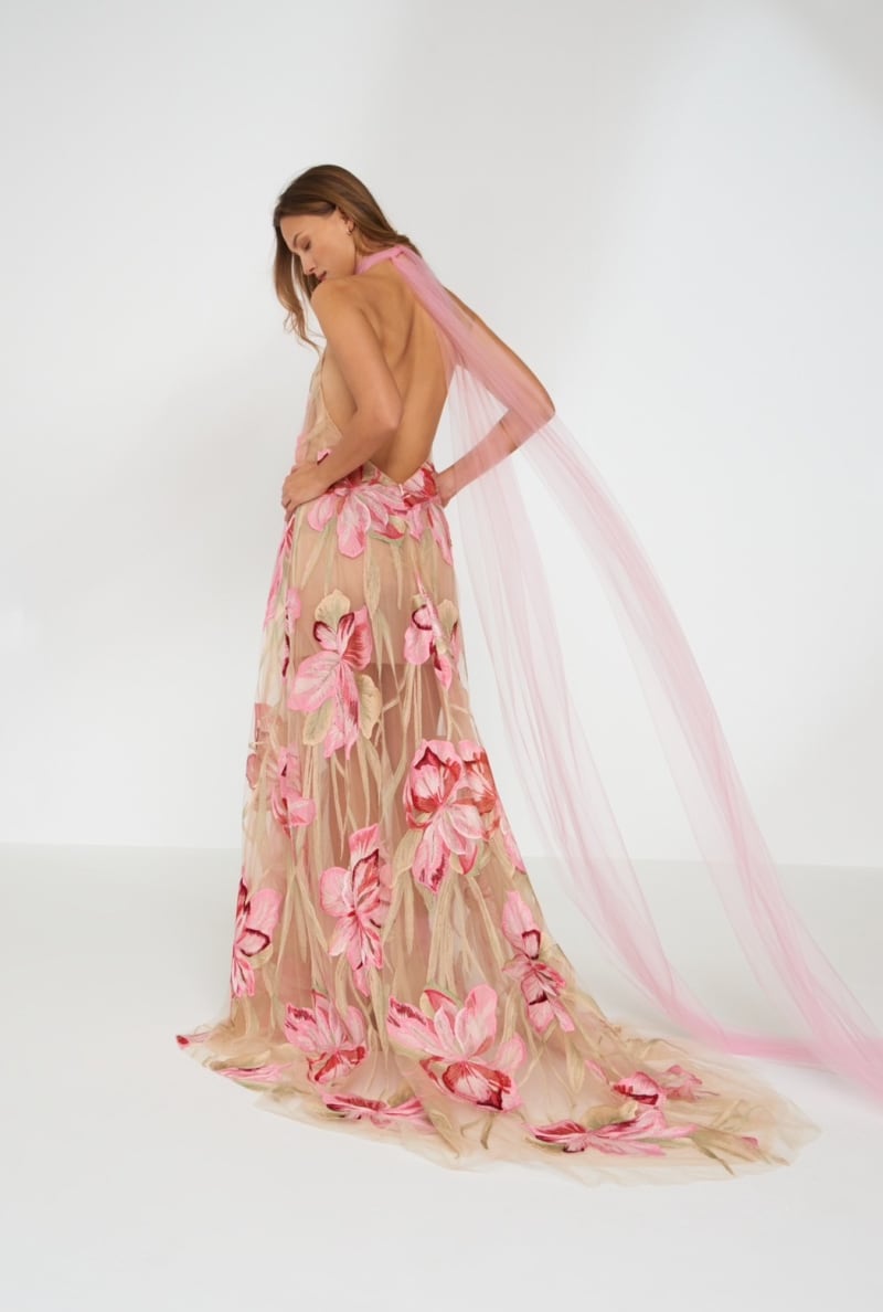 オープンバックシルエットに、立体的な花柄、風に運ばれるように仕上げら
