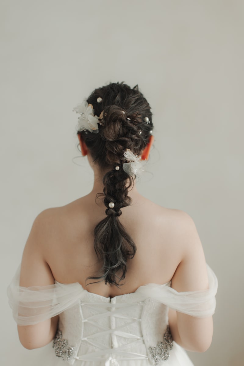 ウェディングドレスではロングヘアをいかしてゆるふわの編みポニー!!