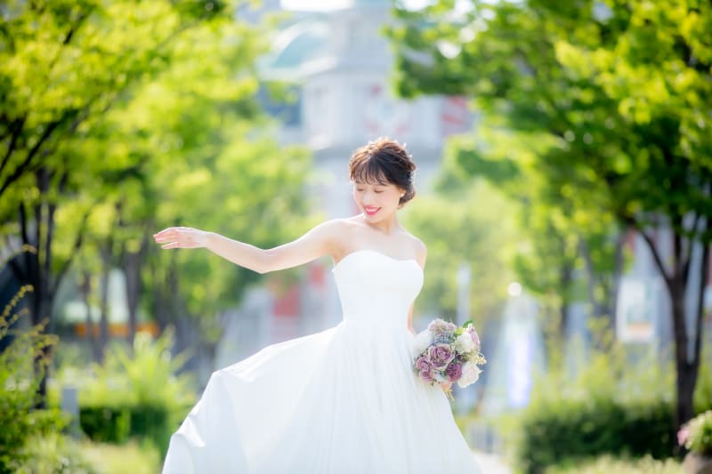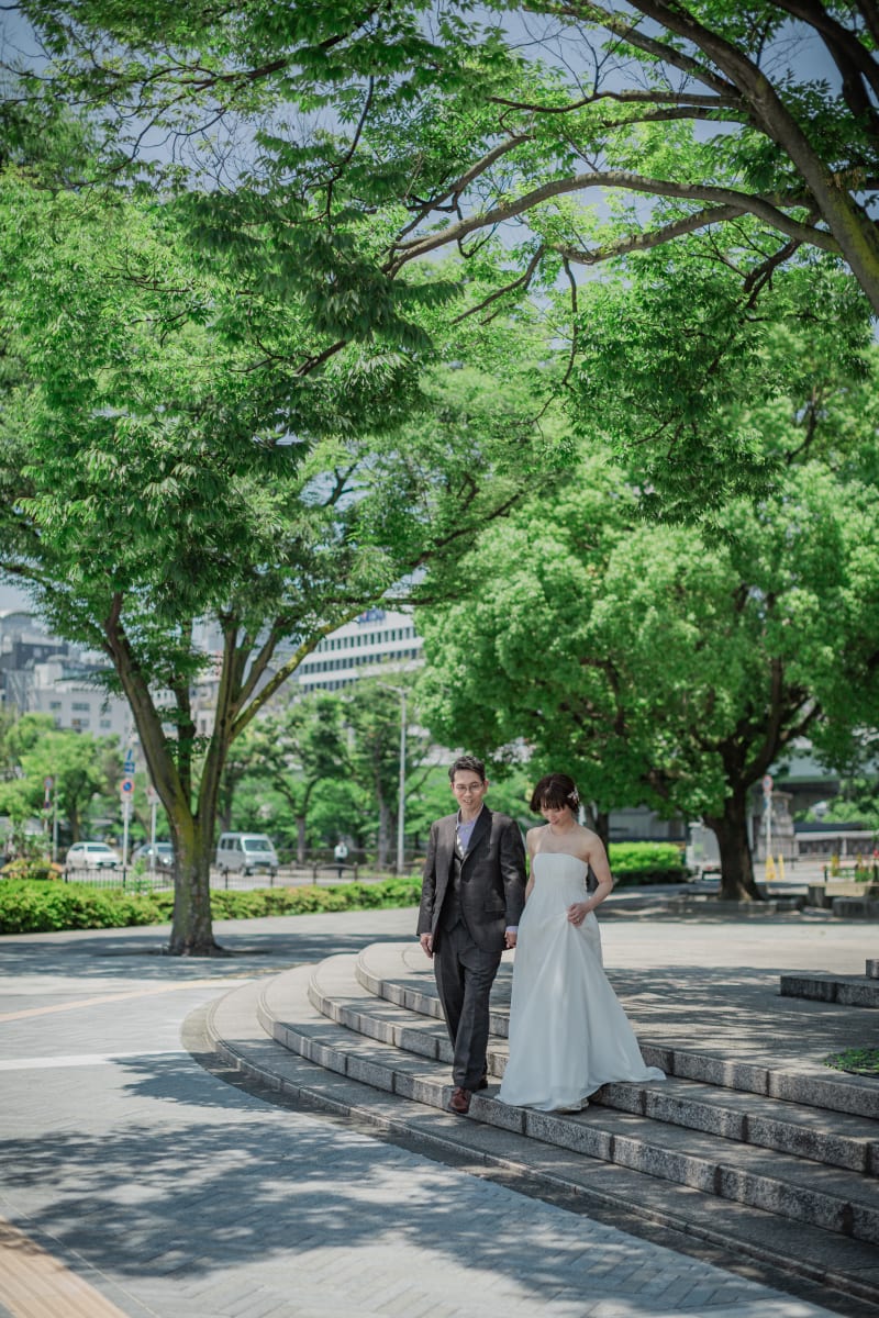 純白のウェディングドレスが町中の緑のなかで一際目を引いてとても綺麗ですね🤍
