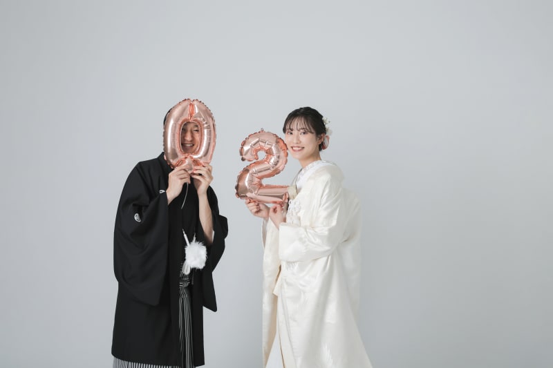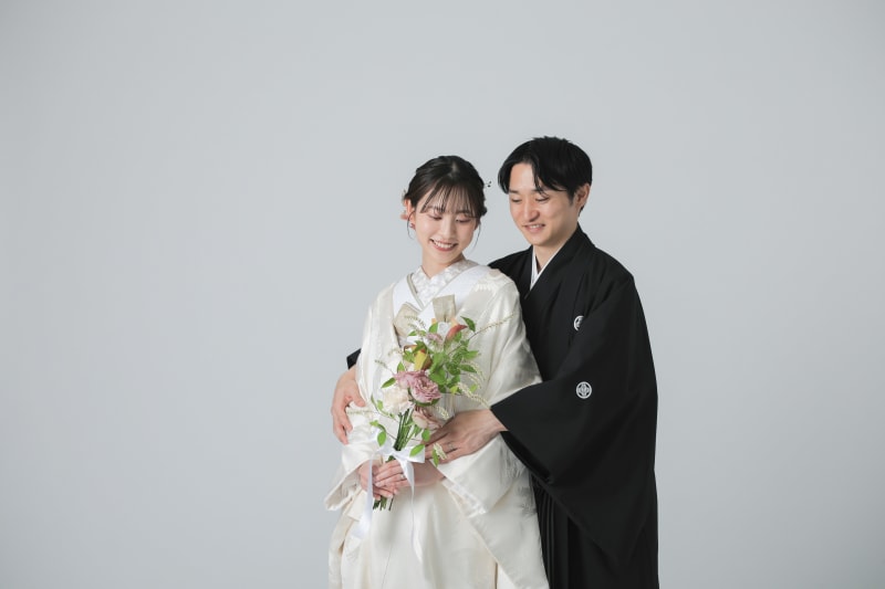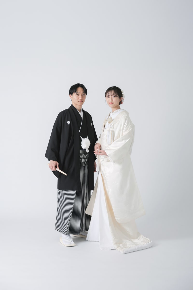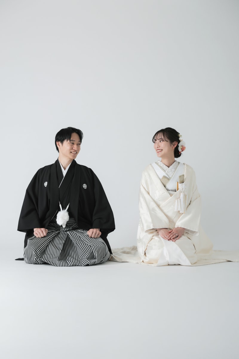 お二人が正面を見た真面目なショットや正座などの和装らしいポーズ