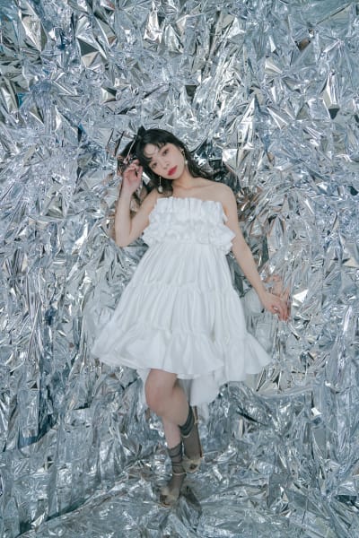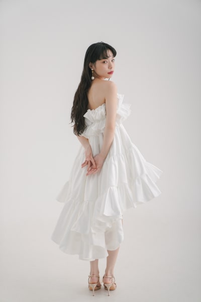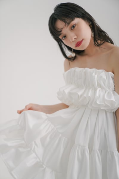 サテン地のミニ丈ドレスです。胸元にはたっぷりのギャザーが入っており、ボリューム感のあるティアードフリルで可愛らしいガーリーな雰囲気〜フェミニンな雰囲気と女性らしさをバランス良く表現してくれます。