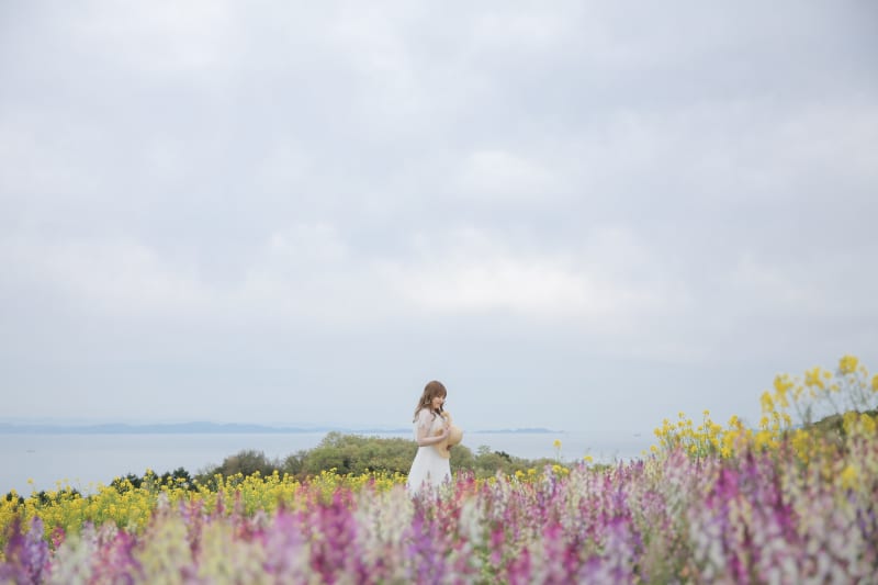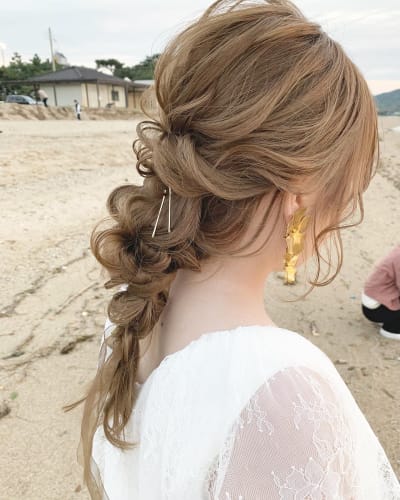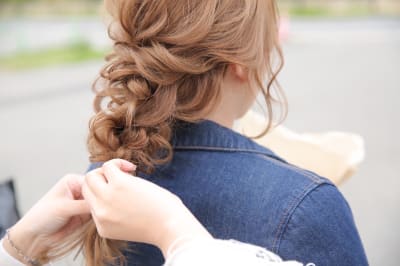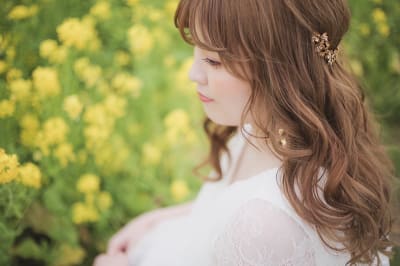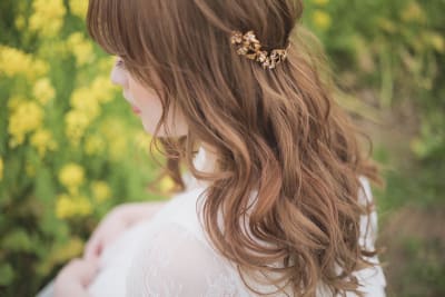 ヘアスタイルは柔らかいパーマ風のダウンスタイル ◯。
