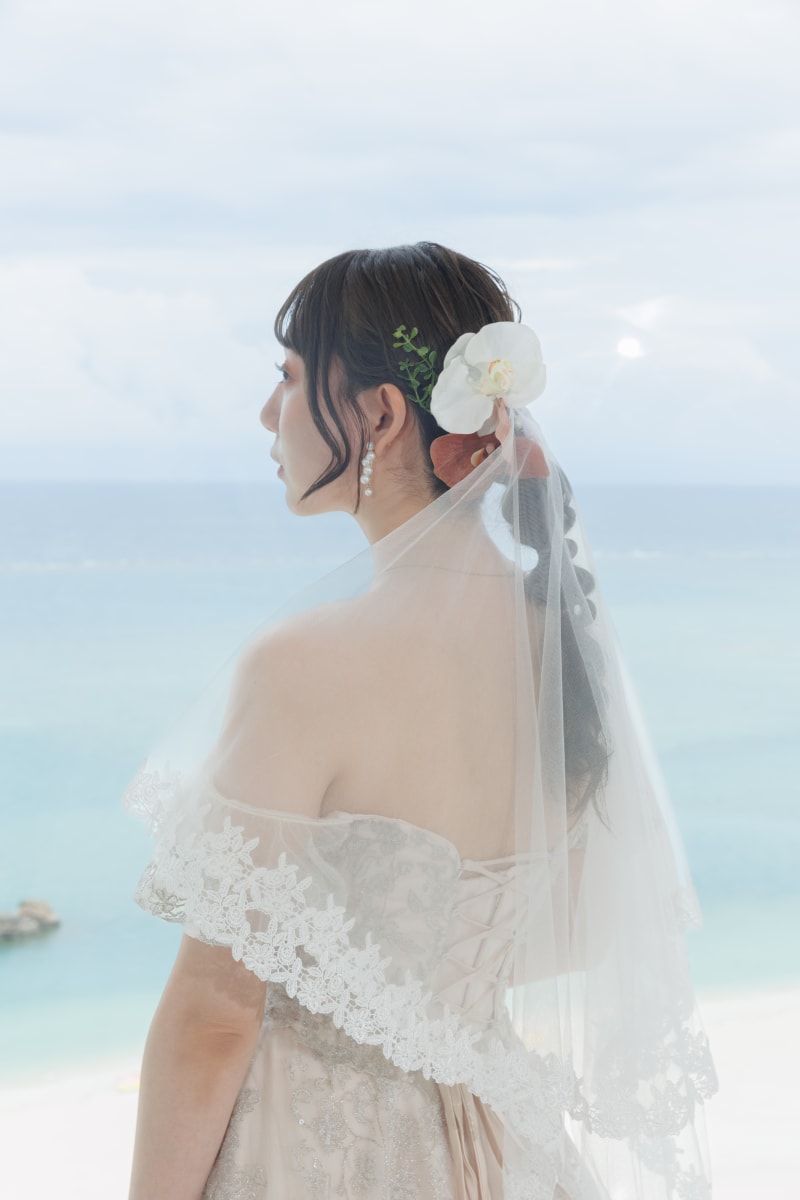最後は編みおろしスタイル 今回新婦様から髪飾りにお花をつけたいとのご要望をいただき造花のお花を沢山装飾しました! 海にも色味が映えたスタイルに♪