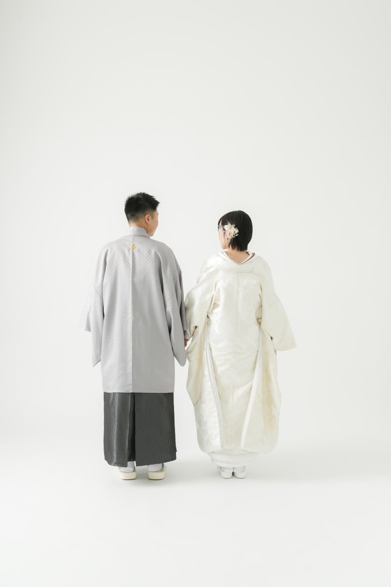 新郎様はラメの効いたグレーのお着物に、光沢感のある黒の袴で合わせメリハリのあるコーディネトに。