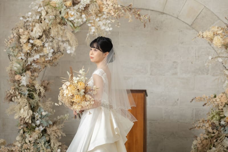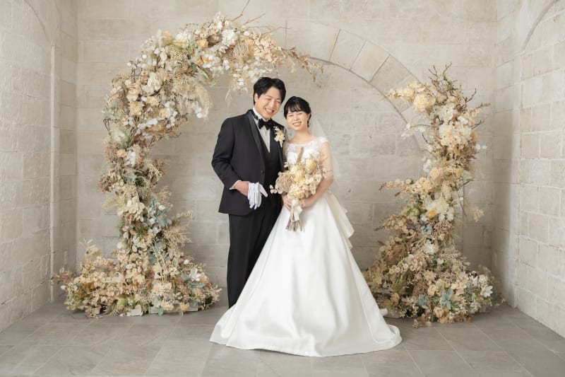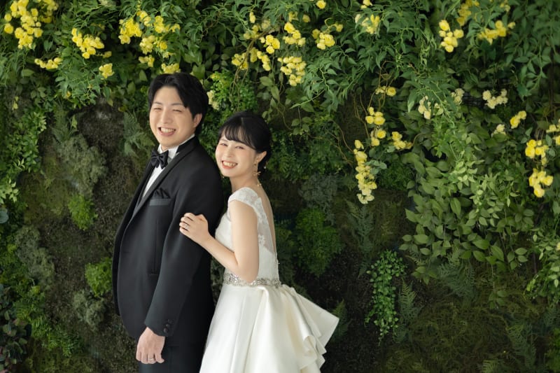 チャペルとは雰囲気が変わりお花の壁での撮影や白の背景での撮影などが可能です!