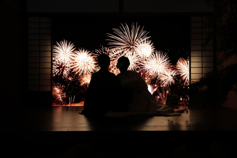 花火鑑賞をしているかのようなこのショット。よりそう後ろ姿が風流ですね。