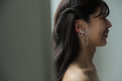 あえてヘアアクセはつけず、大ぶりのリボンのイヤリングで今時可愛いスタイル。