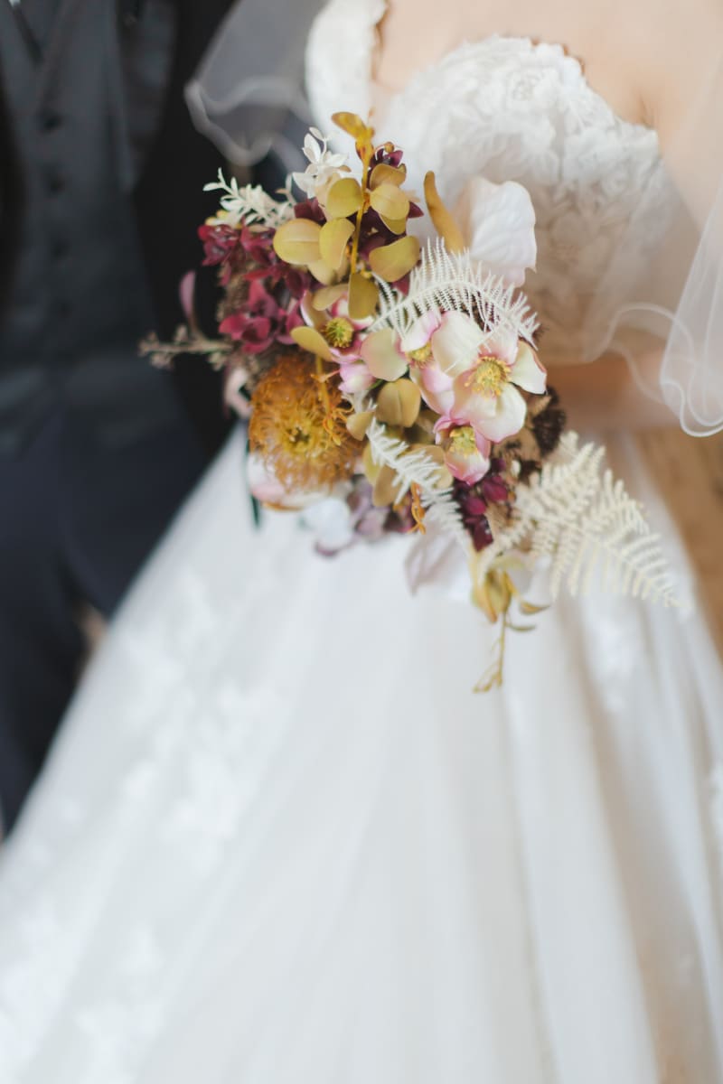 深みのあるカラーのブーケが大人の上品さと華やかさを演出・:*+.