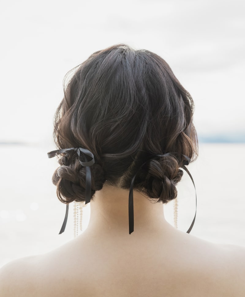 全体にカールをつけて動きを出したツインシニヨンに細めの黒リボンを合わせて^^