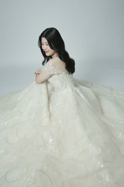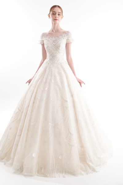 ビーディング刺繍が圧巻の気品あふれるオフショルダードレス。