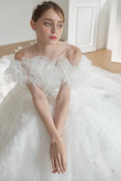 可憐で透明感ある3Dフラワーがこのドレスの魅力にひとつ。