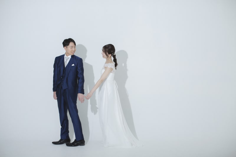 白を基調とした空間で、おふたりが手を取り合い見つめ合う姿を撮影しました。