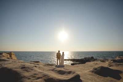 白いビーチのコントラストが非常に美しく、爽やかな洋装に最適。特に夕焼け時は、空
