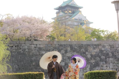 大阪のシンボル大阪城天守閣を背景に、歴史の重みを感じる力強い写真を残せます。洋