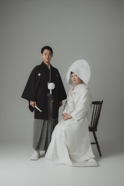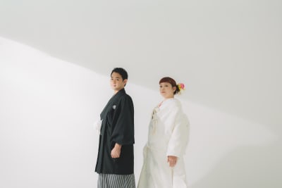 洗練された空間の中で、新婦様の美しい白無垢と、新郎様の凛とした紋付袴姿がより一層際立ちます。
