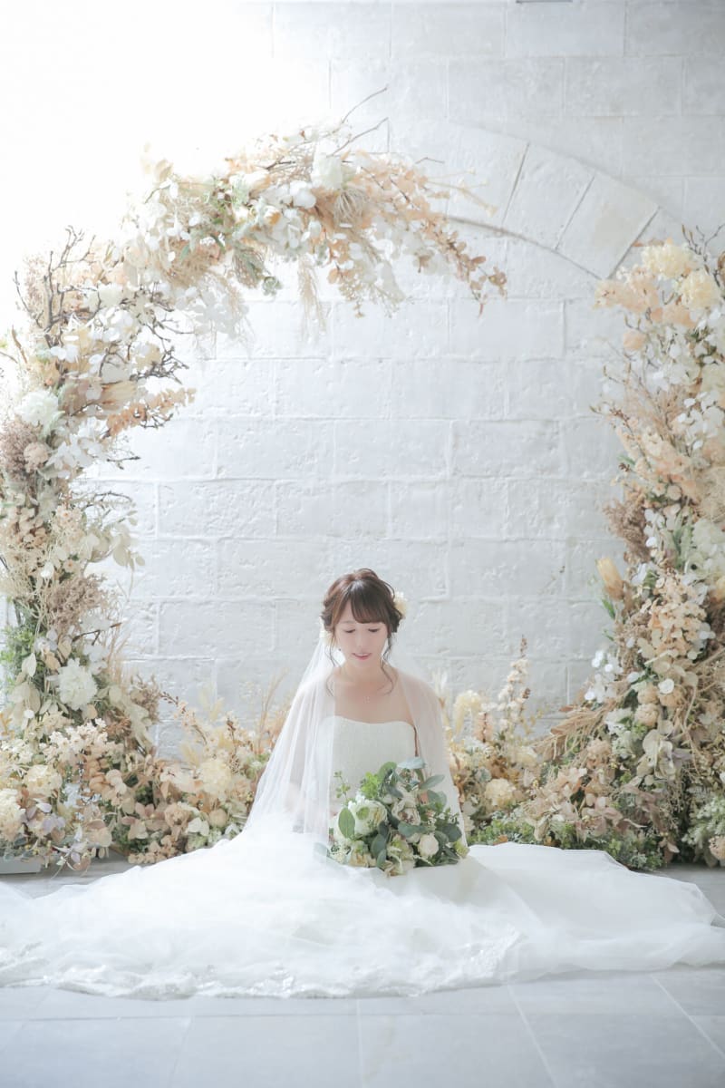 ドレスやタキシードが映える石造りの壁と、ドライフラワー調の装飾がとても魅力的♪