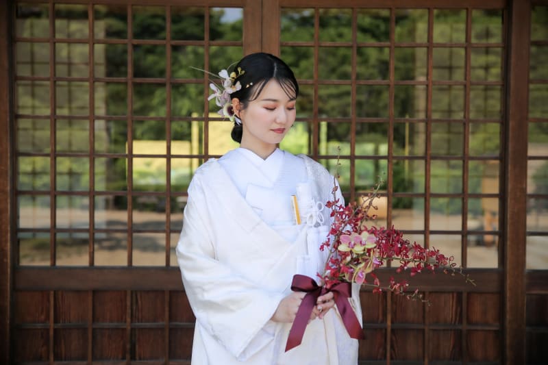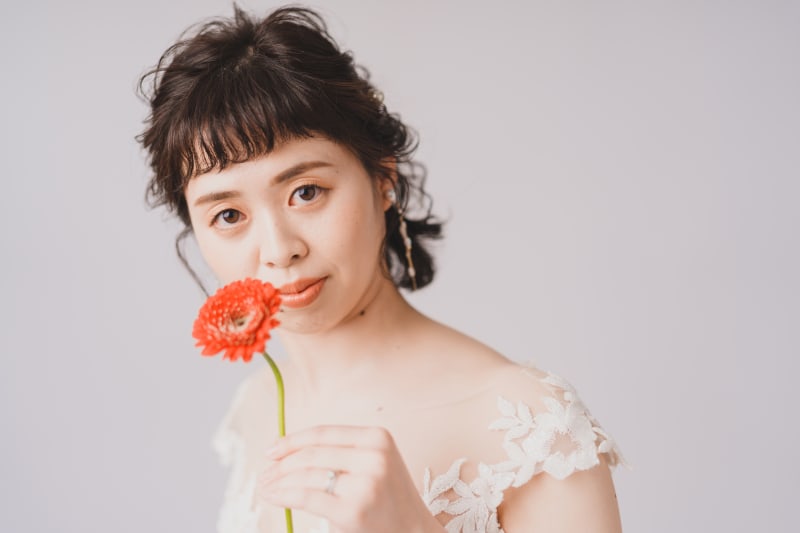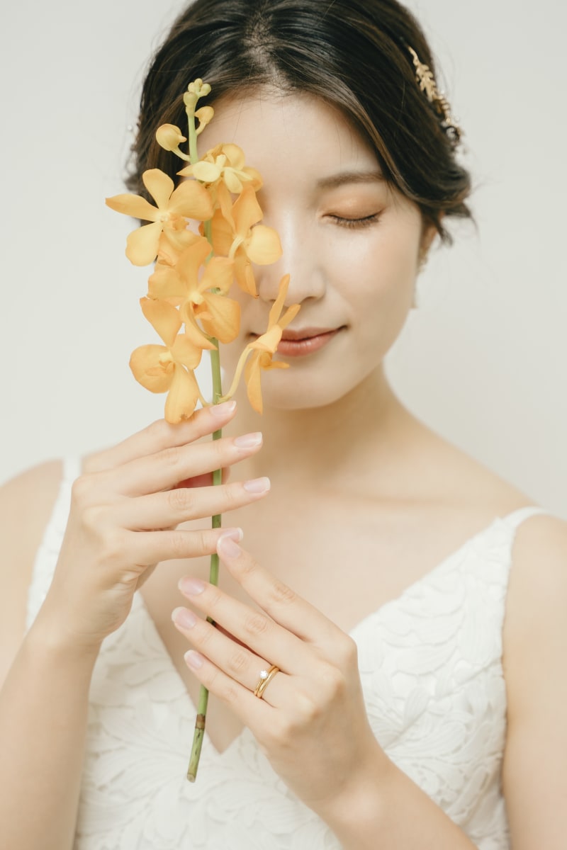 - 続いてはこちらお顔の近くにお花を持ってくるとよりメイクとのバランスが分かりやすく、1枚のお写真に好きを詰めこむことができます💍