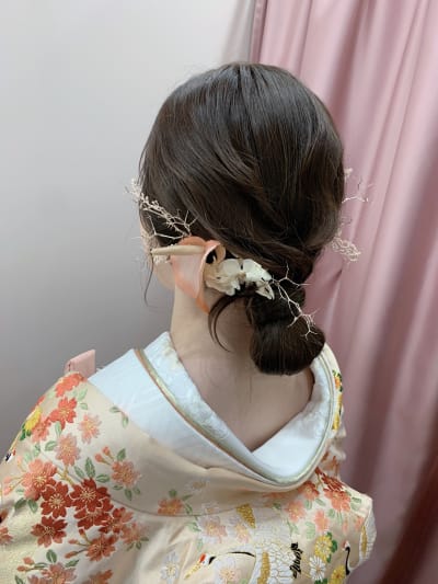 シンプルなヘアスタイルに着物の色味に合わせたお花でまとめました🌸