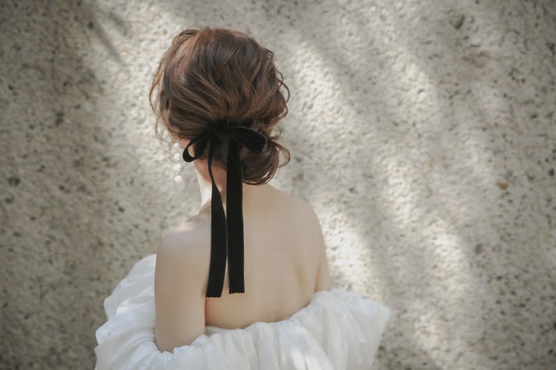 襟足すっきりにリボンのたれを長めに残して。ベロアリボンの存在感もでますね☺︎