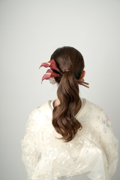 シンプルなポニーテールに凛としたお花がとてもおしゃれで、奇抜に見えて着物にとても映えるヘアスタイルです🎀