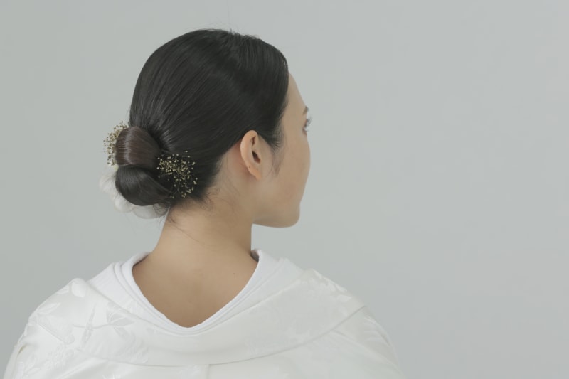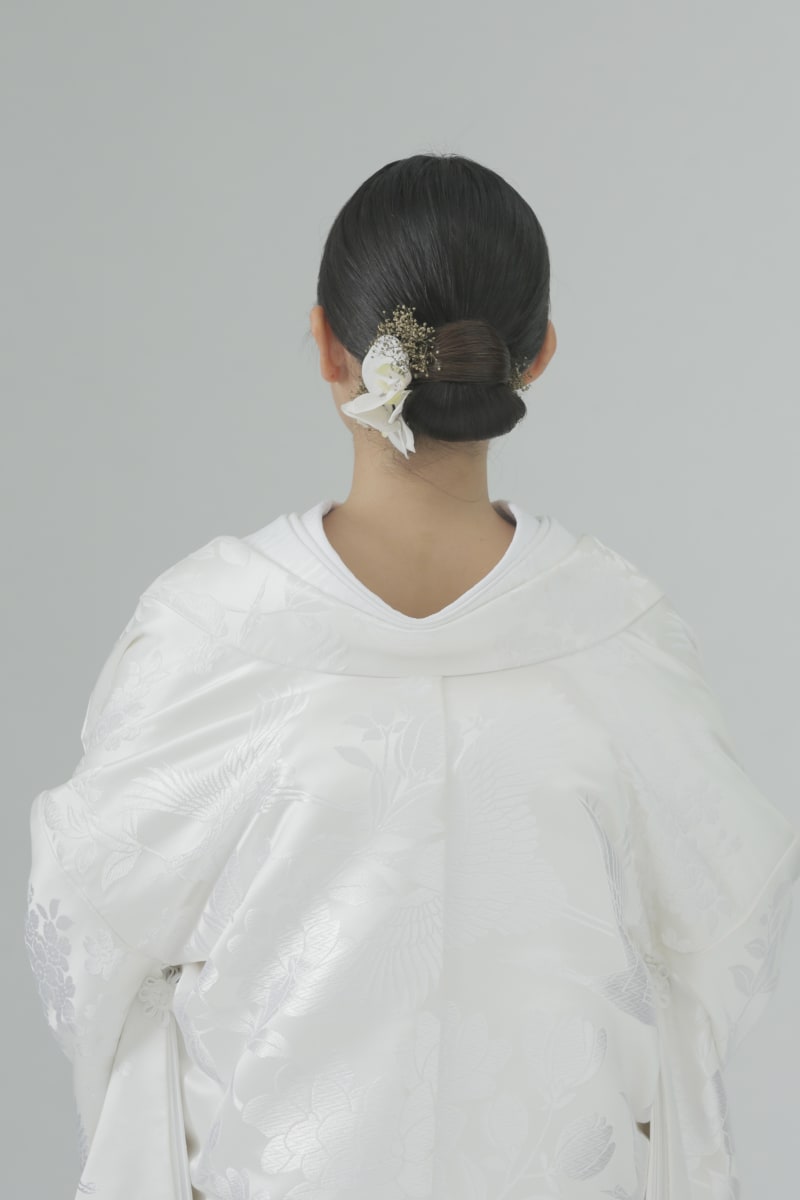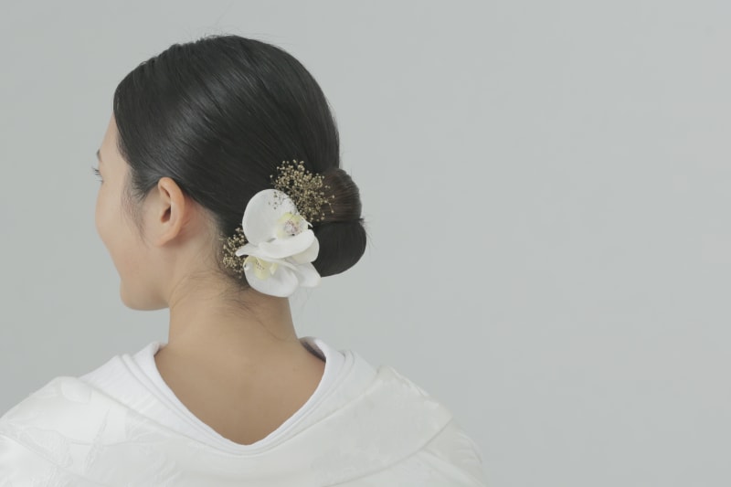 胡蝶蘭とゴールドのお花にし、ヘアスタイルがしっかり見えるようにつけました🫧