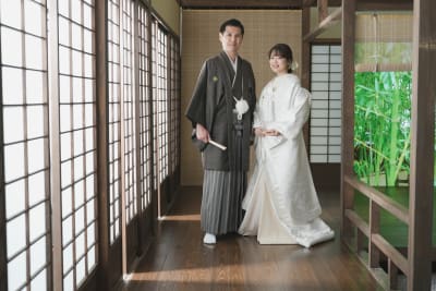 宮大工が手掛けた本格的な茶室で、人目を気にすることなくロケーションフォトのような和装撮影ができます。